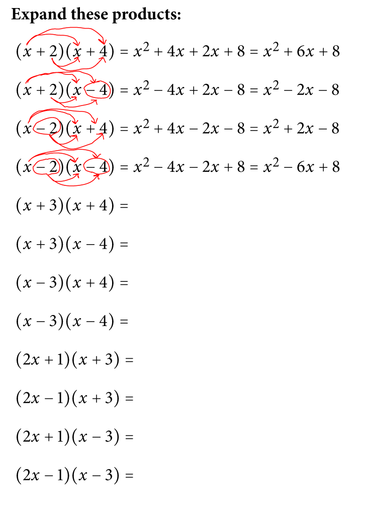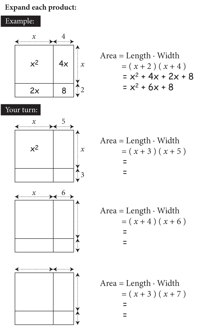 These are excellent materials. More, more! I especially like that you are getting the students to reason about why things work, rather than just teaching them FOIL … a head-scratching technique if there ever was one.