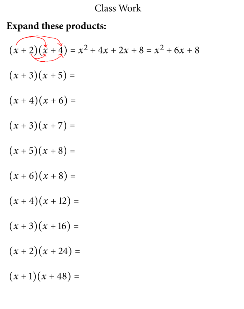Page 2 (front): First examples of expanding quadratics. Note that there is one fully completed example, another partially completed. The back of this sheet has two more problems in various stages of being worked out.
