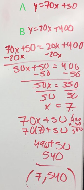 - All of the student groups solved for the variable using the strategy of adding or subtracting quantities from both sides of the equations at first. And, they all showed their work in the same way. Four of the groups chose to subtract 20x as the first step.