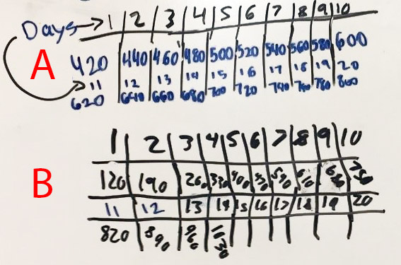 - All of the student groups used “x” as the independent variable. There were other examples from other classes where the variable used was “d” (for days). Similarly, when a dependent variable was used, it was always “y” even though the objects being counted in this problem didn’t suggest the letter “y”.